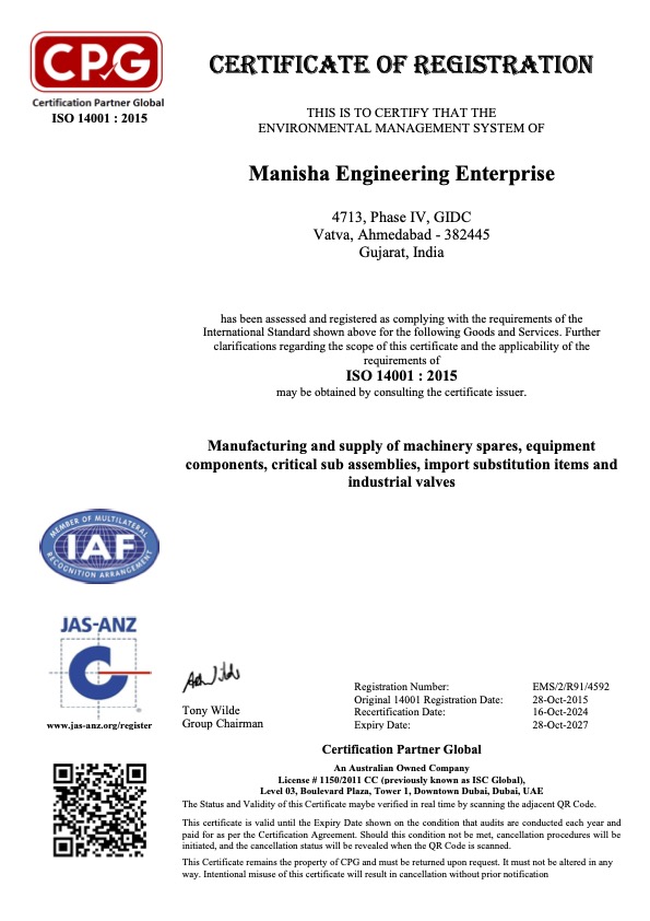 At every stage of the engineering fabrication process, we at Manisha Engineering Enterprise take our responsibility to be environmentally friendly very seriously. Our ISO 14001:2015 accreditation attests our commitment to the same. This globally accepted standard demonstrates our dedication to reducing our impact on the environment, abiding by the law, and continuously improving our operations for a more environmentally friendly future.